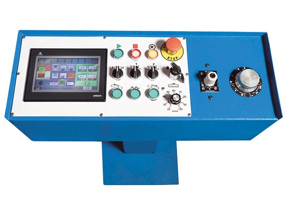ABS 325 S NCDie ABS S NC ist eine Hochleistungs-Produktionsbandsäge in Doppelsäulenbauweise. Die Materialzuführung erfolgt über einen gesteuerten Servomotor mit Kugelgewindetrieb und Messsystem mit einer Positionier- und Wiederholgenauigkeit von + /– 0,2 mm. Der Omron Touchscreen-Controller kann bis zu 30 Programme mit jeweils 50 Schritten speichern. Als Vertreter der Kategorie Horizontale Gehrungsbandsägen überzeugt dieses Modell durch Präzision, Effizienz und Bedienkomfort. Für zusätzliche Flexibilität bietet diese Serie optional auch eine hydraulische Bündelspannung. Der manuell eingestellte Gehrungswinkel kann auf einer digitalen Anzeige abgelesen werden. Die Werkstückspannung erfolgt hydraulisch.