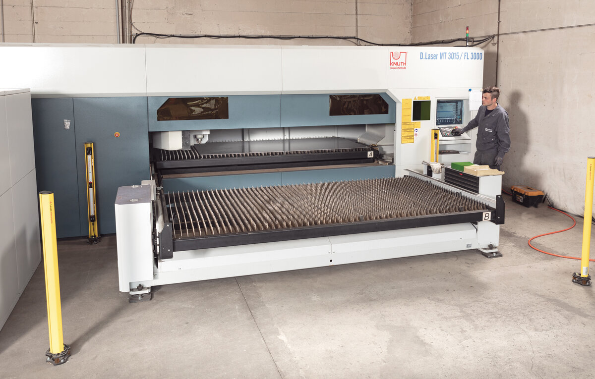 „Für diese Anforderungen haben wir Kitzinger die D.Laser MT 3015 mit einem 3.000-Watt-Faserlaser und automatischem Wechseltischsystem empfohlen“, berichtet Christian Busch, Vertriebsleiter bei KNUTH Werkzeugmaschinen. „Die Anlage erreicht bei geringen Energiekosten einen hohen Wirkungsgrad und ist von Haus aus platzsparend konzipiert.“ Die Anlage und das Engagement der Wasbeker überzeugten am Ende und setzten sich gegen andere Anbieter durch. „KNUTH liefert gute Lösungen für das Schneiden von Blechen, das weiß ich auch aus Gesprächen mit anderen Unternehmen, und sie haben sich wirklich reingehängt“, bestätigt Kitzinger. Mehrfach waren die KNUTH-Spezialisten vor Ort, um die optimale Maschinenkonfiguration festzulegen und die Komponenten der Laseranlage passend zu den Raumverhältnissen in Handewitt anordnen zu können. Um ausreichend Platz zu schaffen, wurde die alte Laseranlage durch KNUTH verkauft und die vorhandene Plasma-Schneidanlage gemeinsam umgestellt.
