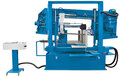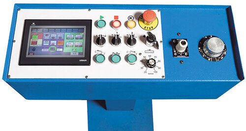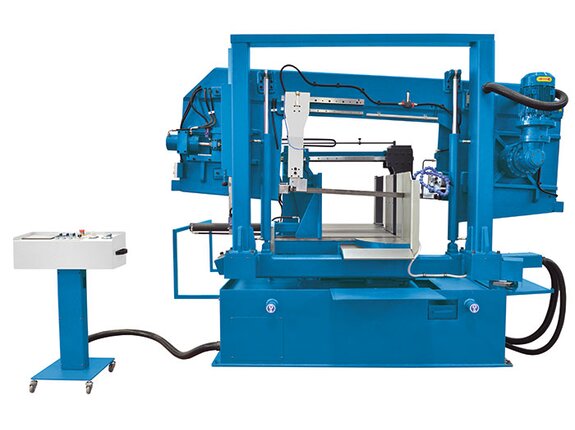 ABS 540 S NCThe ABS S NC is a high-performance production band saw with a dual column design. The material is fed via a controlled servo motor with ball screw drive and measuring system with a positioning and repeat accuracy of +/- 0.2 mm. The Omron touchscreen controller can store up to 30 programs with 50 steps each. For additional flexibility, this series also offers hydraulic bundle clamping as an option. The manually set miter angle can be read on a digital display. The workpiece is clamped hydraulically.