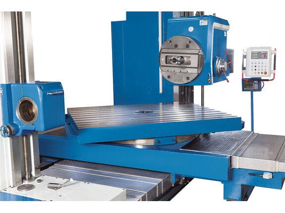 BO 130The BO series of conventional boring and milling machines with a fixed column is designed for horizontal multi-sided drilling and milling of workpiece weights of up to 10 tons. The movable table can rotate 360°. The drill head moves on the column and the spindle has a long stroke on the W-axis. Efficient machining and short non-productive times result from high drive power and automatic feeds on all axes with rapid traverses. In addition, these conventional boring mills have a facing slide with a long stroke.