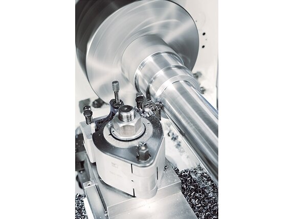 Sinus 330/1500 DSinus D is the largest series in the universal lathes segment. The construction follows a classic design but is based on a heavy, one-piece cast machine bed. As with heavy-duty lathes, the frictional connection between the motor and the spindle takes place via a manual multi-disc clutch. With integrated functions such as the removable bed bridge, rapid traverse and a taper turning device, this series offers optional solutions for machining long workpieces or large flanges.